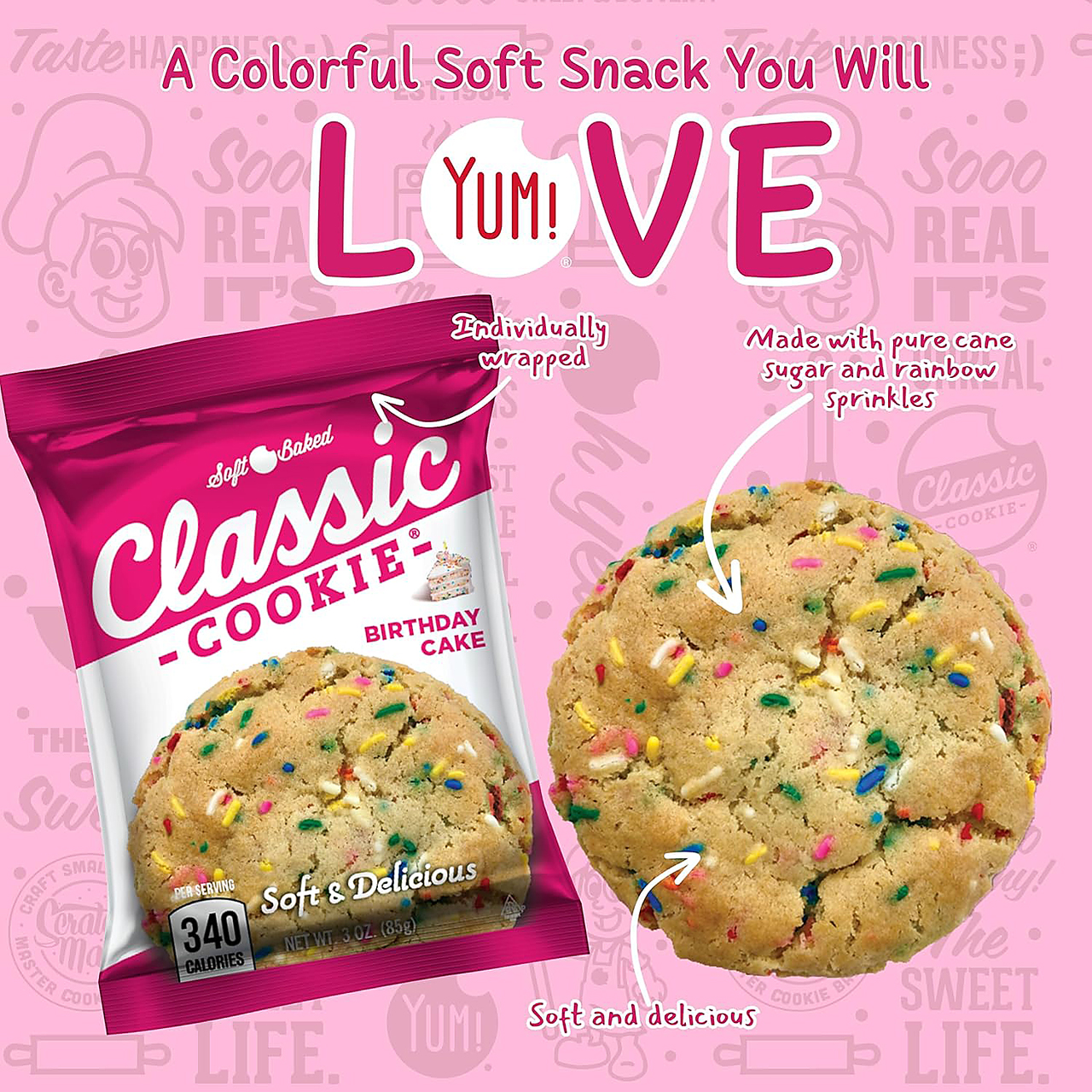 Classic Cookie Birthday Cake captures the sweet flavor of birthday cake in a soft baked cookie filled with colorful sprinkle-inspired fun. This festive cookie stands out in dessert snack assortments, bakery treat sections, and grab-and-go sweet snack displays. Its playful flavor and soft texture make it a fun option for customers looking for celebration-inspired cookies and colorful sweet treats.