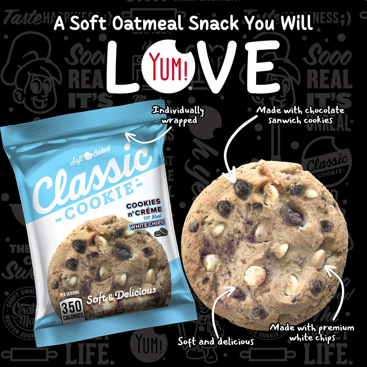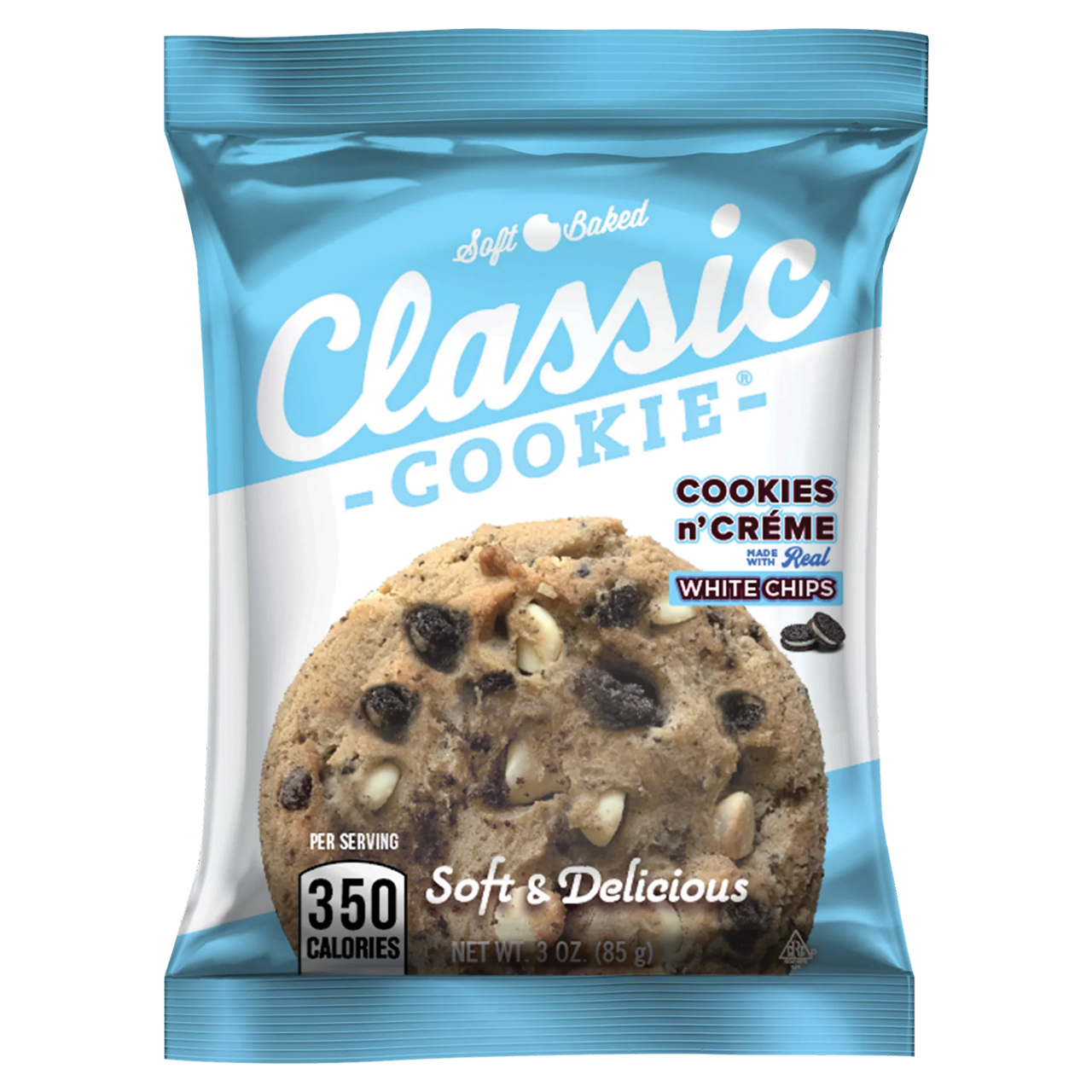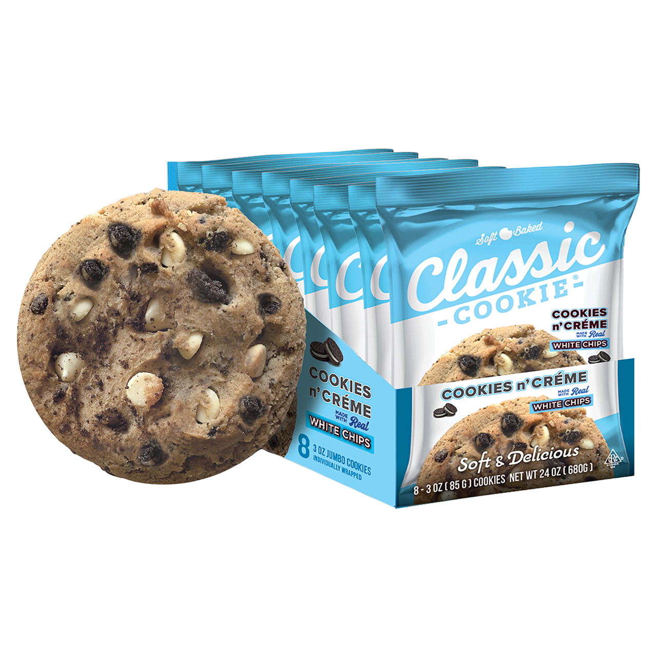 Classic Cookie Cookies N Creme combines chocolate cookie pieces with creamy white chocolate style flavor in a soft baked cookie. This rich dessert-inspired cookie works well in bakery snack assortments, sweet treat displays, and everyday grab-and-go dessert sections. Its cookies and cream flavor profile makes it a popular choice for shoppers looking for indulgent soft baked cookies.