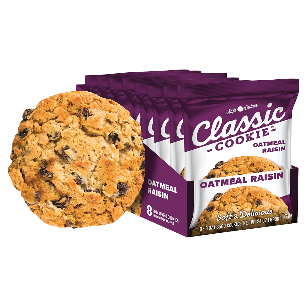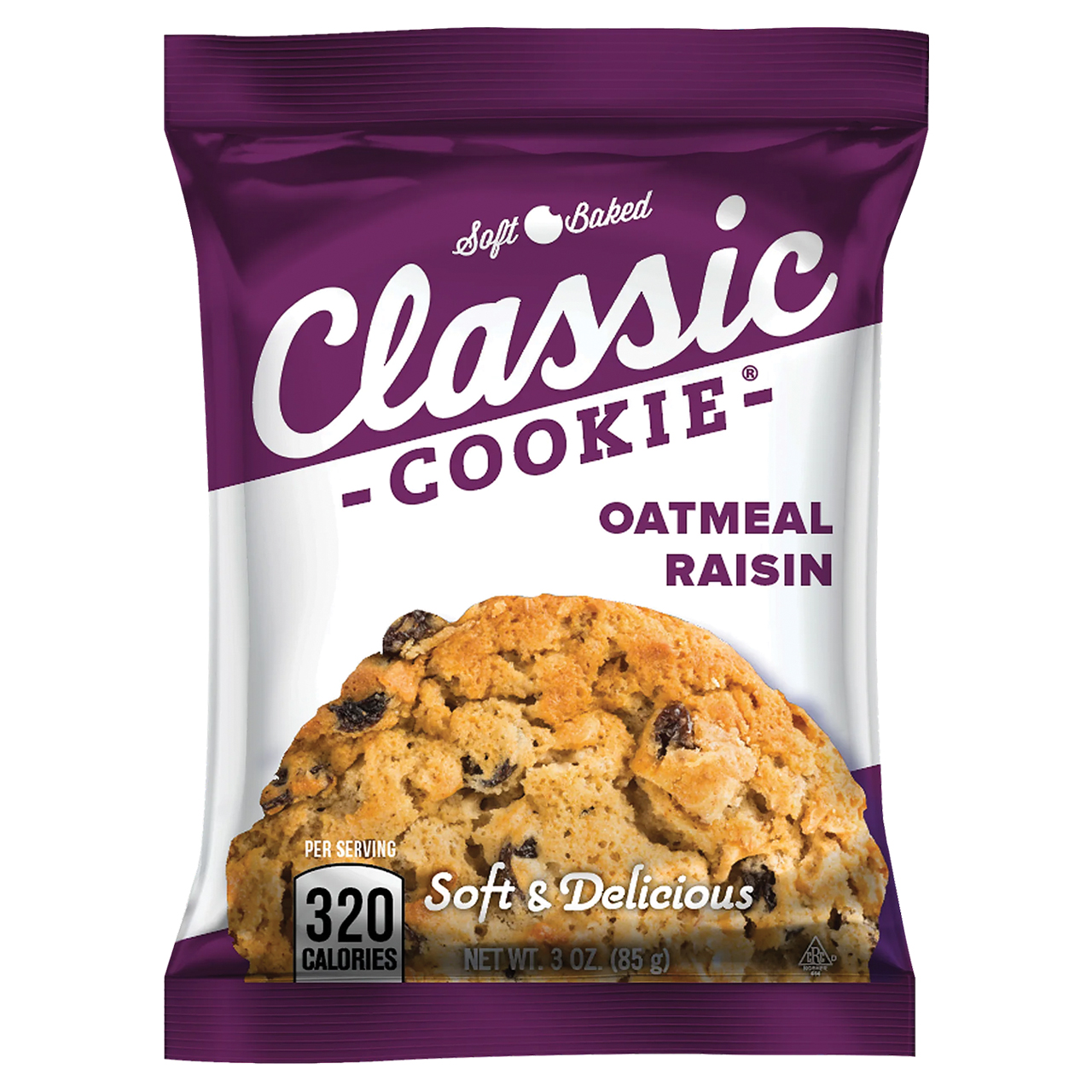 Classic Cookie Oatmeal Raisin combines chewy raisins and hearty oats in a soft baked cookie with familiar homemade-style flavor. This classic cookie fits well in bakery snack assortments, lunchbox treat sections, and grab-and-go dessert snack displays. Its traditional flavor profile makes it an easy choice for shoppers looking for soft oatmeal raisin cookies and comforting baked treats.