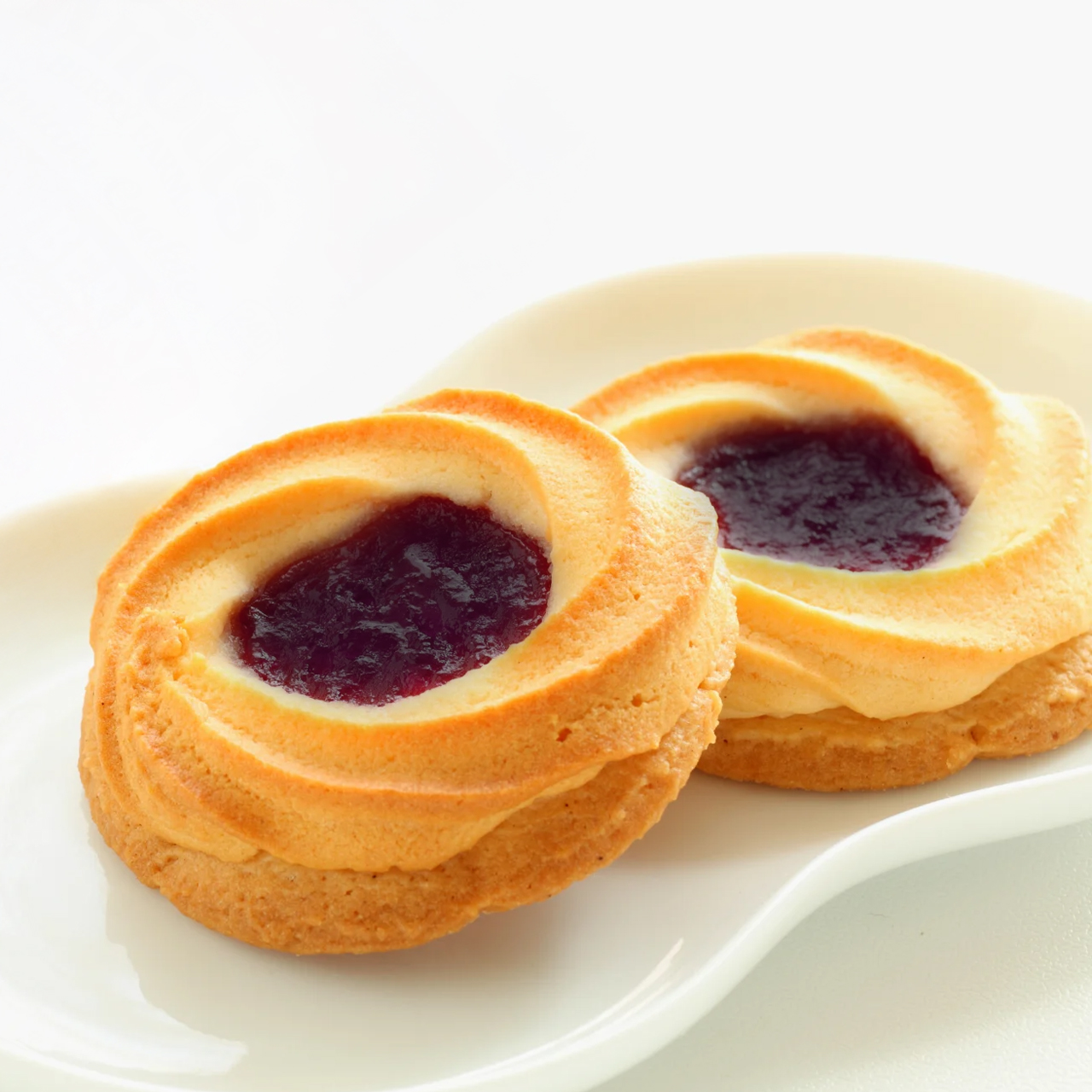 - Buttery shortbread cookies filled with boysenberry jam