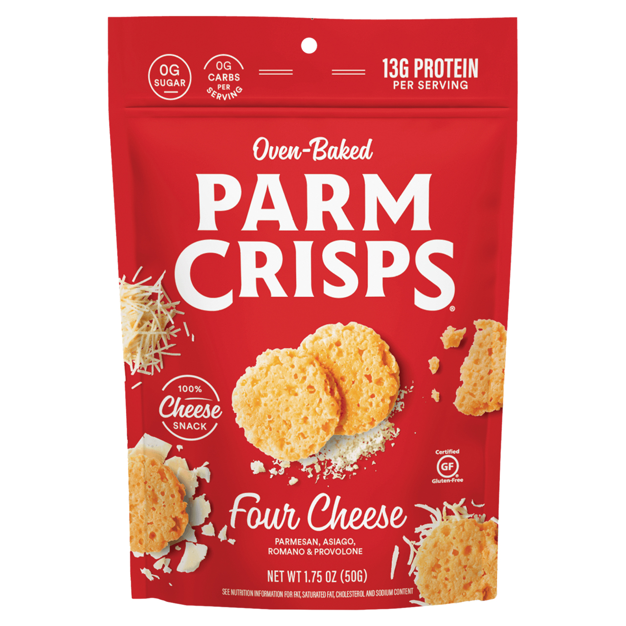 Parm Crisps Four Cheese offer a bold, savory cheese snack made entirely from baked cheese for a crisp, crunchy bite. The four-cheese blend delivers rich flavor that works well in better-for-you snack assortments, low-carb snack displays, and grab-and-go savory snack sections. Their crispy texture and intense cheese flavor make them a strong option for customers shopping for baked cheese snacks.